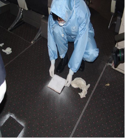 6、布粉调查鼠迹。靠舱壁的地毯上先垫上硬纸板,然后布撒滑石粉,间隔5m,与其他捕鼠工具交替放置,以便于观察鼠迹。关闭所有舱门,将垃圾和卧具一同带下飞机。如不关舱门,飞机着地点周边放置粘鼠板和鼠夹,以防止地面鼠类窜上飞机。
