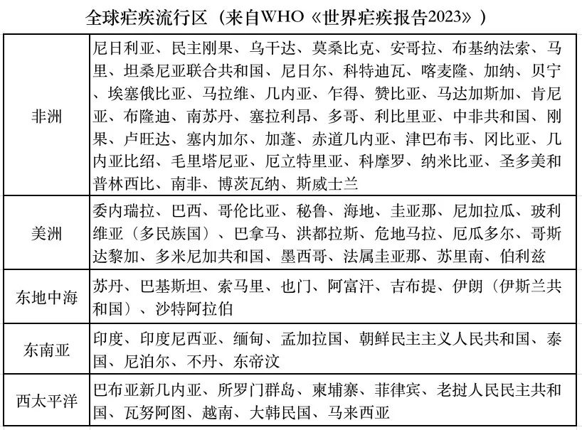 3. 疟疾主要流行于非洲、东南亚、美洲、东地中海地区的85个国家,疟疾流行区回国人员一旦出现发热等症状,请及时就诊。
